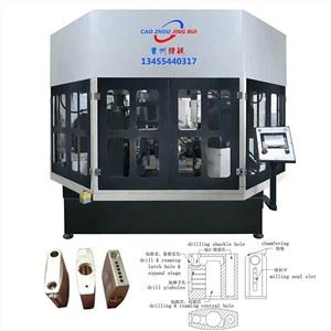 Deze slotmachine is een combinatie-uitrusting om een kleine hangslotschelp te verwerken. Het kan alle gaten in de slotschaal in één keer verwerken. Eenmalige positionering zorgt voor de nauwkeurigheid van de bewerking en de locatie van de gaten.